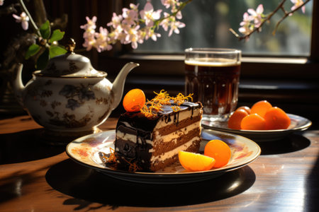 Side view of chocolate cheesecake with kumquat served with tea, generative AI