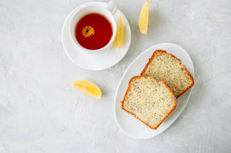Slices of homemade lemon poppy seed cake served on a white plate, a cup of tea on a white stone background. Top view and copy space.