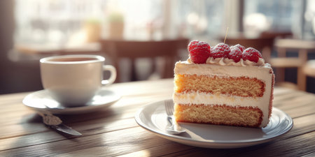 AI Generated. Delicious Vanilla Cake Slice with Fresh Berries and Coffee Cup