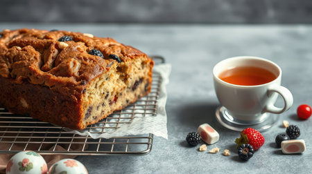 Freshly baked fruit loaf with tea and colorful candies on a cooling rack at a cozy kitchen setting