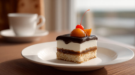 A delectable square cake features layers of moist sponge, smooth cream, rich chocolate glaze, and a colorful fruit topping on a white plate.