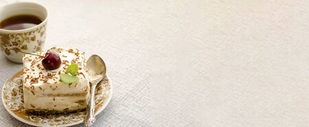 Tiramisu, traditional Italian dessert on a light background. In the foreground pastries, decorated with chocolate chips and cherries in a saucer, a cup of tea. Japanese forfor, vintage. Close-up. Banner. Copy space