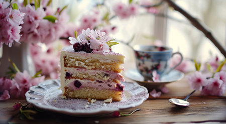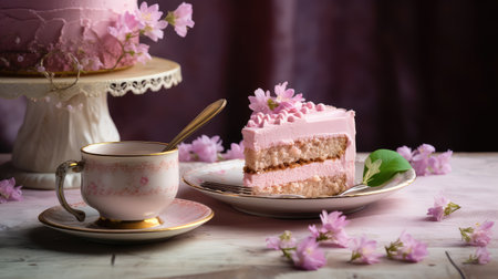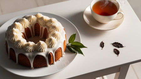 AI Generated. Delightful Cake with Cream and Tea on a Table