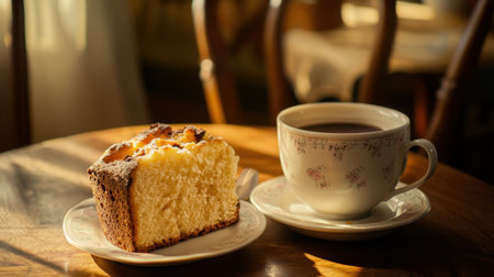 Enjoying a slice of cake with a cup of tea by the window on a sunny autumn afternoon