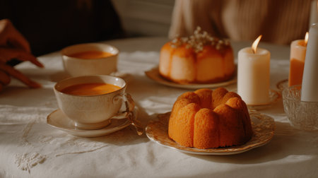 Enjoy a cozy afternoon with tea and delightful desserts, surrounded by the warm glow of candles. Perfect for inviting friends over for sweet moments.
