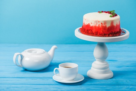 cake decorated with red currants near white cup and tea pot isolated on blue