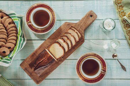 Light green wooden background with a sliced cake on the cutting board, sugar cubes and a porcelain cup of tea