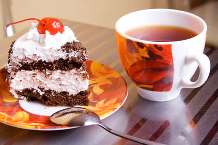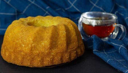 Still life with a piece of cake and morning tea - a delicious breakfast on a dark background
