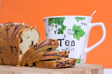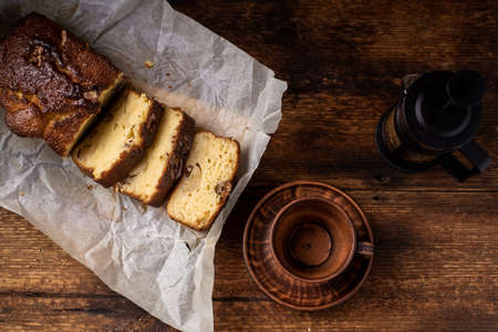 Tea party and banana bread. A cup of herbal tea. Banana bread sliced. Dark wooden background.