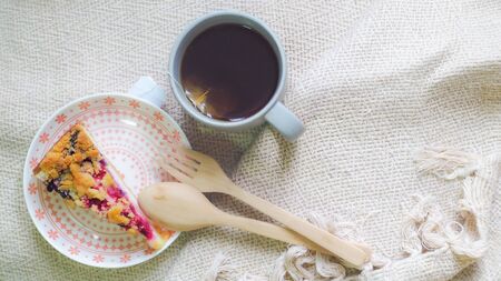 blueberry cheese cake on plate and a cup of coffee morning breakfast