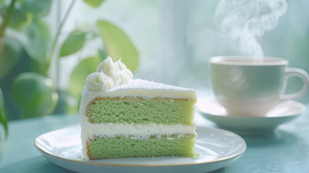 A delightful slice of fresh green cake sits elegantly on a plate beside a steaming cup of coffee, creating a cozy and inviting atmosphere perfect for relaxation.