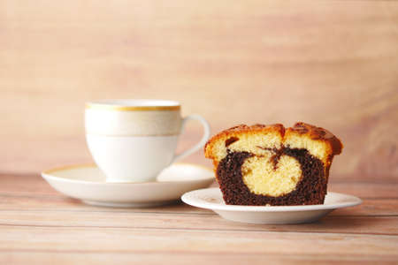 Tea cup and pastries piece on wooden table. Breakfast. Top view