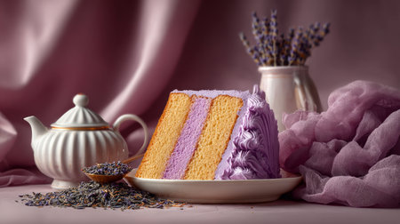 Elegant Tea Party Scene Featuring Lavender Earl Grey Cake Slice and Decorative Spoonful of Herbs