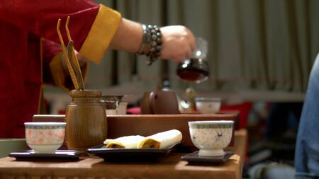 The master of tea ceremonies pours amber tea in a thin stream into tasting cups. Close-up with a blurry background