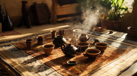 A tranquil scene of tea preparation on a rustic wooden table, with steam rising from pottery. This image captures warmth, relaxation, and cultural ritual in a serene setting.