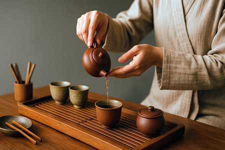 A serene morning scene with steaming tea being carefully poured into earthenware cups, illuminating the ritual's essence.