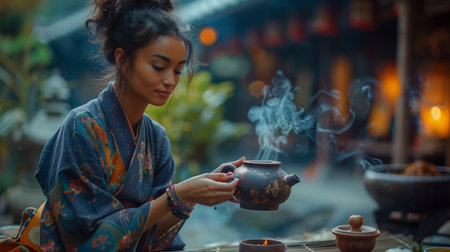 Person in kimono conducting a Japanese tea ceremony with steaming tea bowls, showcasing harmony, respect, purity, and tranquility.
