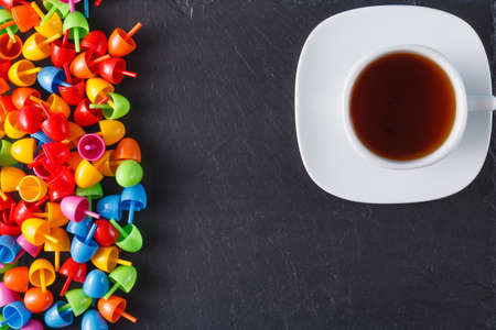 Plastic colored mosaic on black slate background