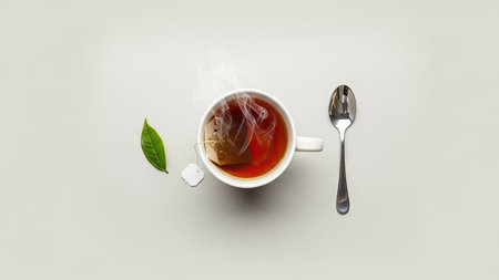 An overhead shot presents a white teacup filled with steaming, dark tea. A silver spoon and a sugar cube are placed next to the cup, along with a green leaf. The scene is lit with soft light, set against a plain background, suitable for various editorial and commercial applications.