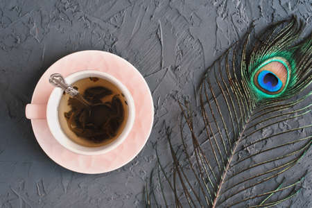 Cup of green tea and decorative peacock feather on concrete background. Morning inspiration