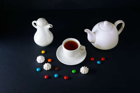 White cup, teapot and milk jug on a black background. The background is decorated with multi-colored sweet drops and meringues.