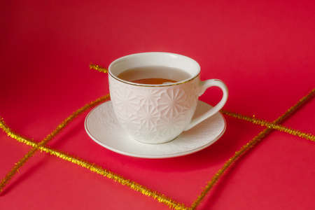 White cup of tea red background, christmas yellow tinsel, home comfort concept