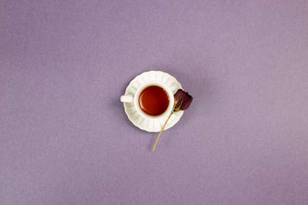 Cup of black tea with dry rose flower on purple background. top view, copy space