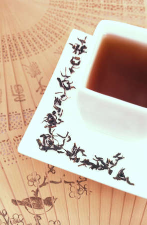 Dried leaves of Chinese tea in a beautiful kiramic soda. Tea ceremony. Red traditional Chinese drink. Dark utensils.