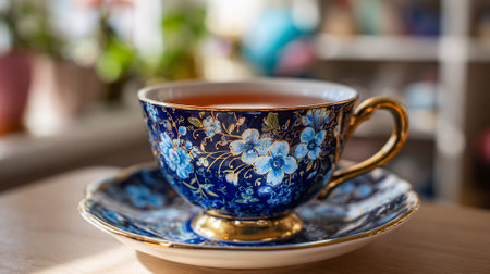 A delicate floral teacup filled with tea on a matching saucer in a cozy setting