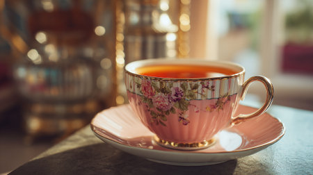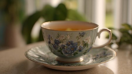 A delicate floral teacup filled with tea on a matching saucer in a serene setting