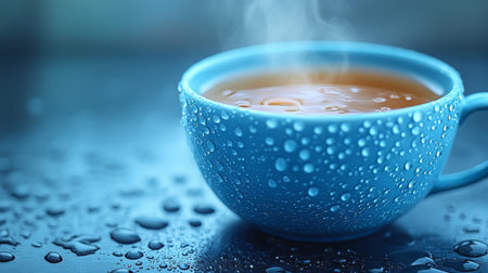 Warm cup of tea with steam rising on a rainy day, showcasing droplets on blue mug. Generative AI