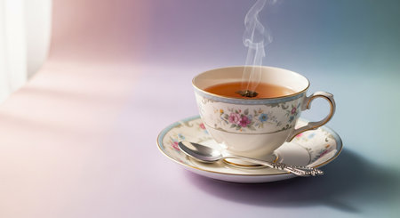 A delicate tea cup filled with steaming hot tea on a decorative saucer