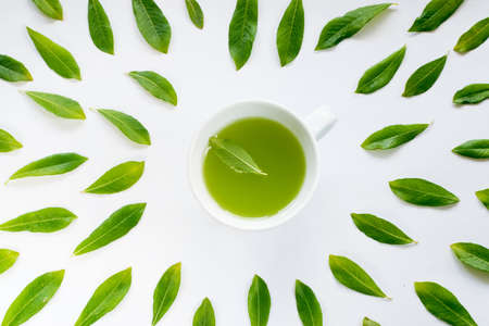 Cup of black tea with green tea leaves on white background.