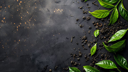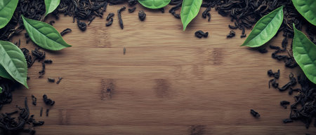 Dark wooden table adorned with green and black tea leaves, teacup nestled among them. Scattered leaves create a natural backdrop, ideal for food, drink, and nature projects.