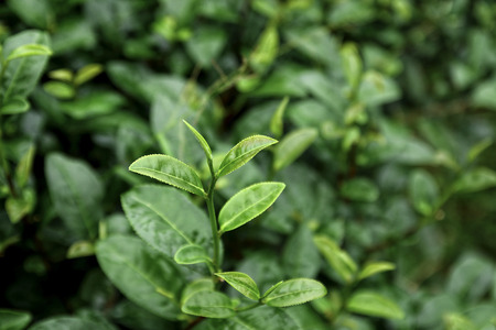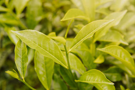 Closeup, Top of Green tea leaf in the morning, tea plantation, blurred background. A leaf of Chinese camellia, from which green and black tea are made