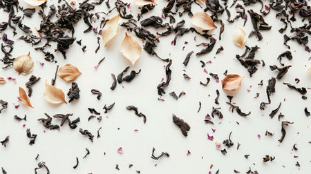 Top view, close-up of high-resolution Oolong tea leaves on a white background.