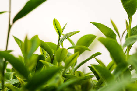 Tea garden close up view of tender green tea leaves