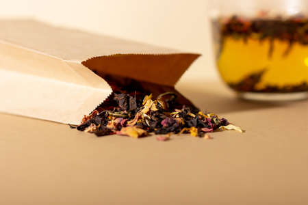 Dried tea leaves scattered on a white background from a small glass glass