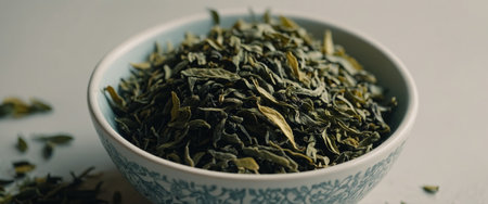 Scattered ground tea leaves form a textured layer on a pristine white surface, while vibrant green tea leaves peek through, adding contrast and freshness to the composition.