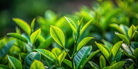 Fresh green tea leaves display vibrant array of textures and shades, showcasing their natural beauty and vitality. lush foliage creates serene and calming atmosphere, perfect for nature lovers