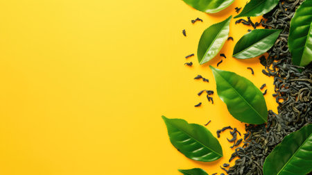 Loose leaf black tea with fresh green leaves on vibrant yellow background