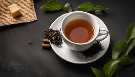 A cup of rich black tea sits elegantly on a white surface, accompanied by fresh green leaves, creating a serene and inviting atmosphere for relaxation.