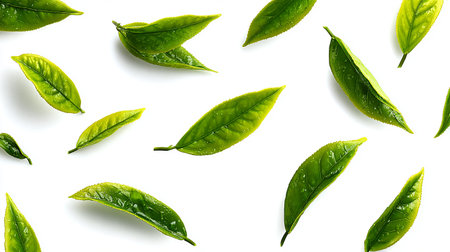Fresh Green Tea Leaves with Water Droplets Arranged on a Clean White Background for Healthy Organic Herbal Beverage Branding, and Natural Spa Wellness Concepts Backdrop with Copyspace for Text Design