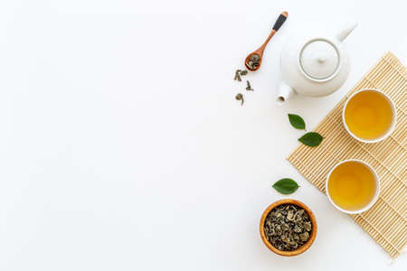 Green Tea Composition with tea leaves on white background, banner. Chinese traditional tea set, tea culture concept, top view, copy space.