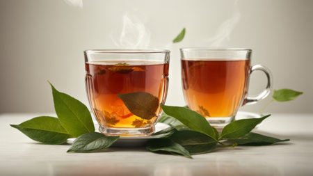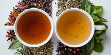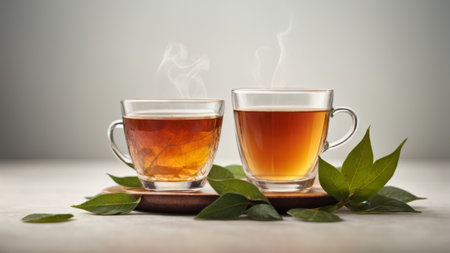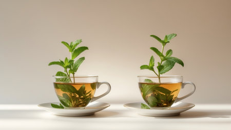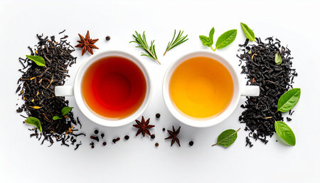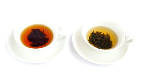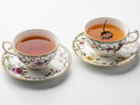 The image features two teacups, each adorned with intricate floral designs, placed on matching saucers. One teacup contains a light-colored tea with a tea bag, while the other holds a darker tea. The teacups and saucers are set against a plain white background, highlighting their delicate patterns and the rich colors of the tea.