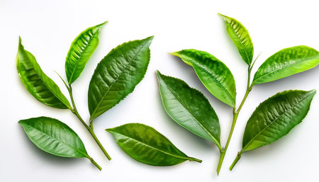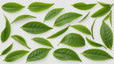 A collection of fresh green leaves arranged randomly on a transparent background, showcasing their natural shapes and veins.