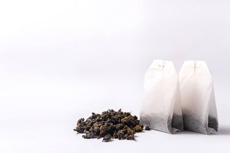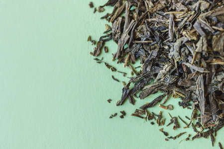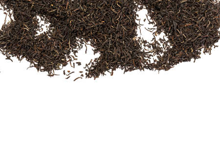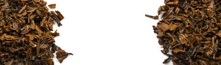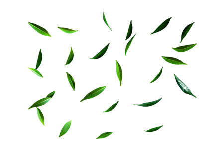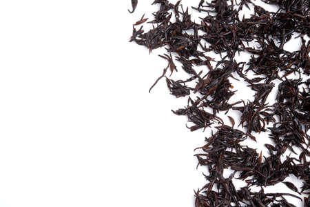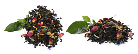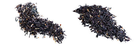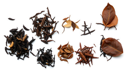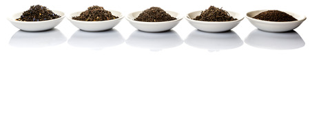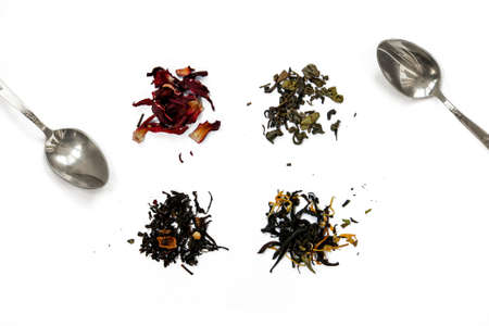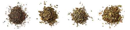 dry tea leaves collection isolated on white background. Top view. Flat lay pattern.
