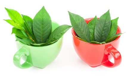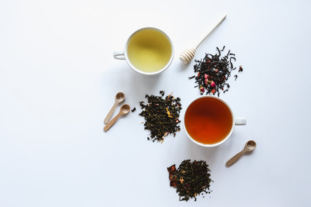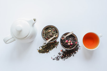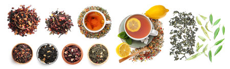 Collection of six different tea types in cups, scattered on white background with tea leaves. Horizo