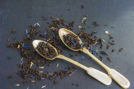Loose black tea with few dried flowers on yellow board, view from above space for text right side