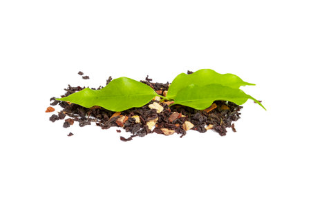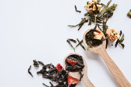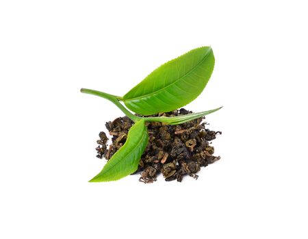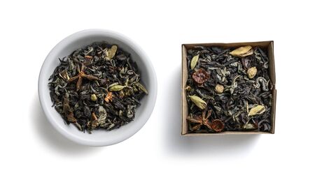 Fragrant Leaves of Chinese Dry Tea Top Grade with Goji Berries and Powdered Acai on White Background